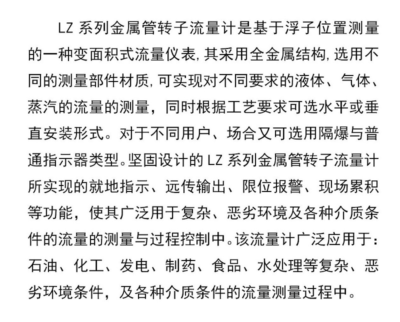LZ系列金屬管轉子流量計是基于浮子位置測量的一種變面積式流量儀表,其采用全金屬結構,選用不同的測量部件材質,可實現(xiàn)對不同要求的液體、氣體、蒸汽的流量的測量,同時根據(jù)工藝要求可選水平或垂直安裝形式。